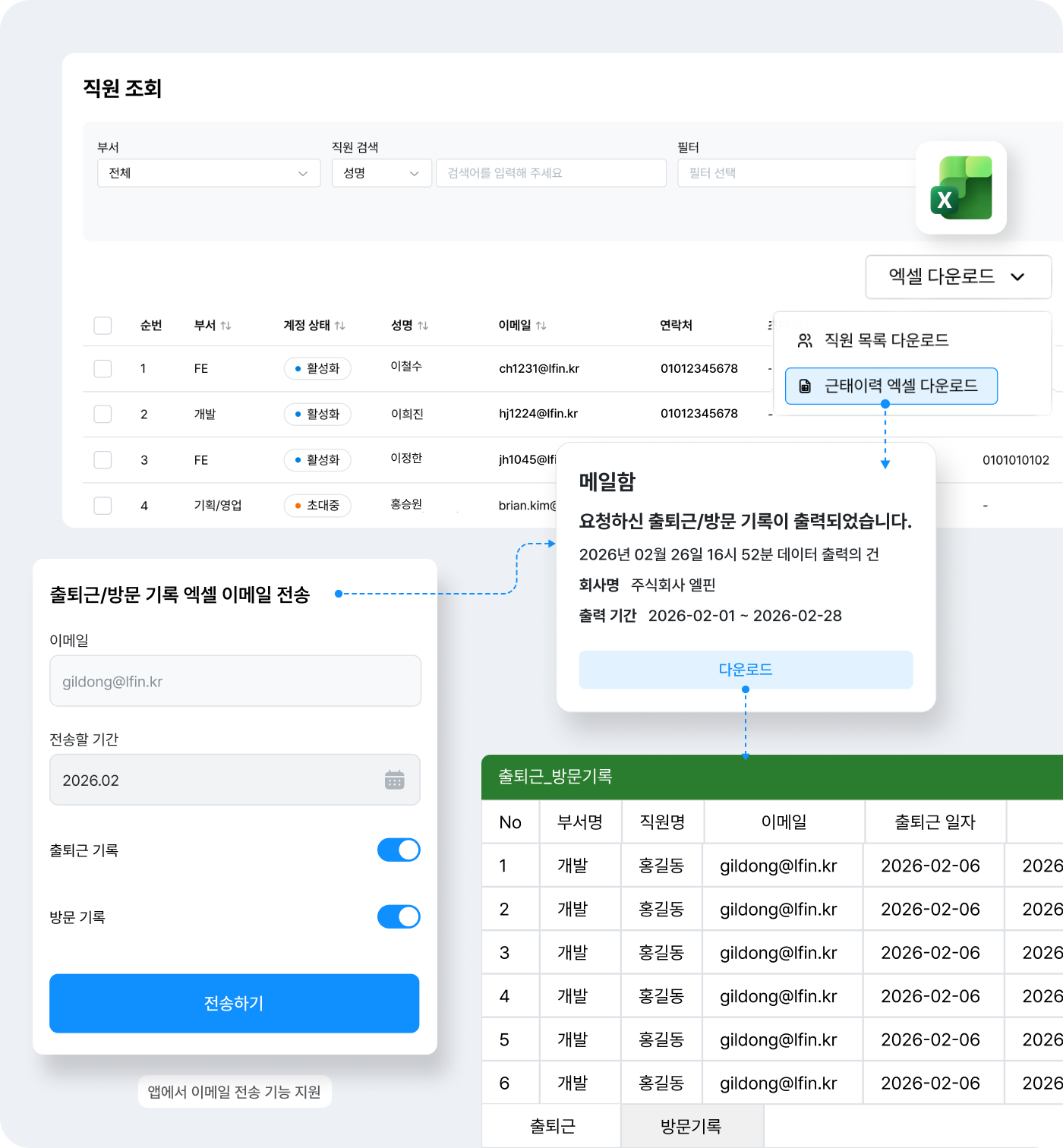 - 근로자의 출퇴근, 방문 기록별로 일괄 엑셀 다운로드