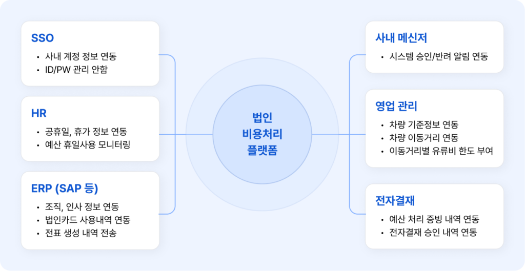 각 업무 시스템 통합(Integration)을 통하여 비용처리 담당자의 업무 부담을 30%이상 줄일 수 있습니다.